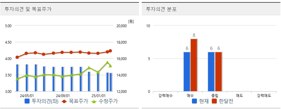 최근 6개월 동안 전체 증권사의 평균 목표주가는 약 16,879원으로, 직전 6개월 평균인 16,525원 대비 소폭 상승했습니다. 이는 증권사들이 기업은행의 향후 실적과 주가에 대해 낙관적인 전망을 유지하고 있음을 보여줍니다.