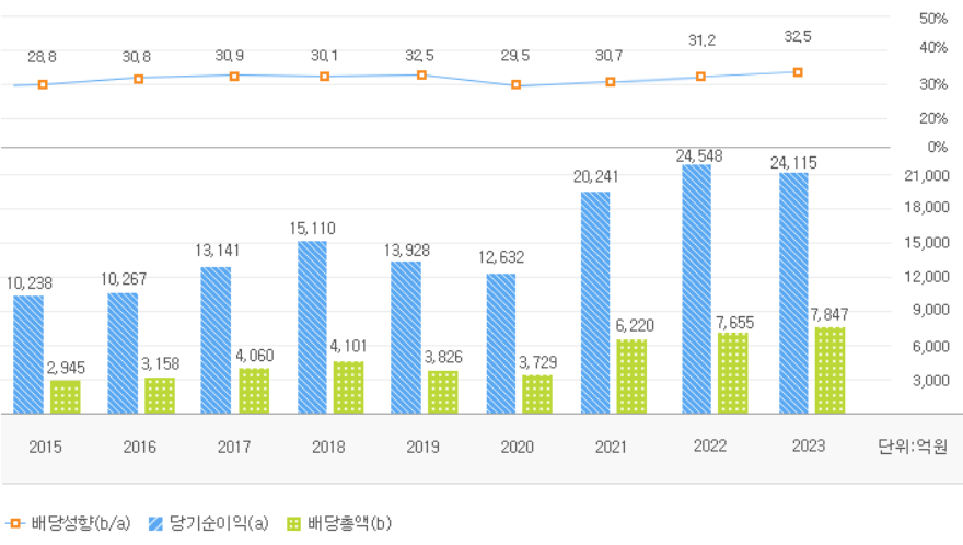 - 안정적인 실적: 2024년 연결 순이익은 약 2조 6,738억 원으로 최근 3년간 비슷한 수준을 유지했으며, 2025년에는 사상 최대 실적에 재도전할 것으로 보입니다.