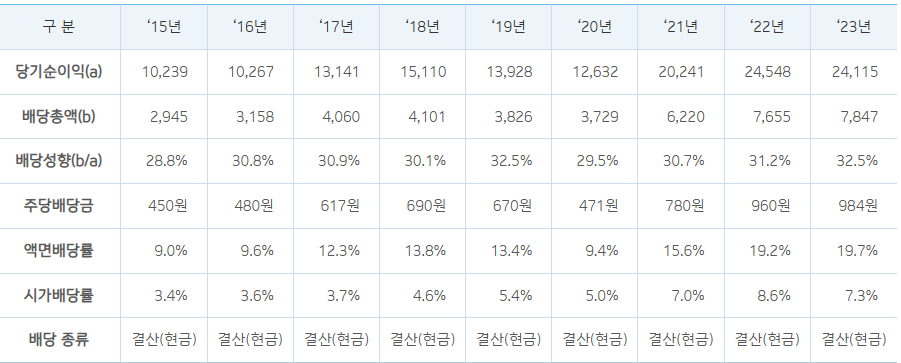 - 배당금 증가 가능성: 주당 배당금은 전년도(984원)보다 소폭 증가할 것으로 전망되며, 이는 투자 매력을 높이는 요인입니다.