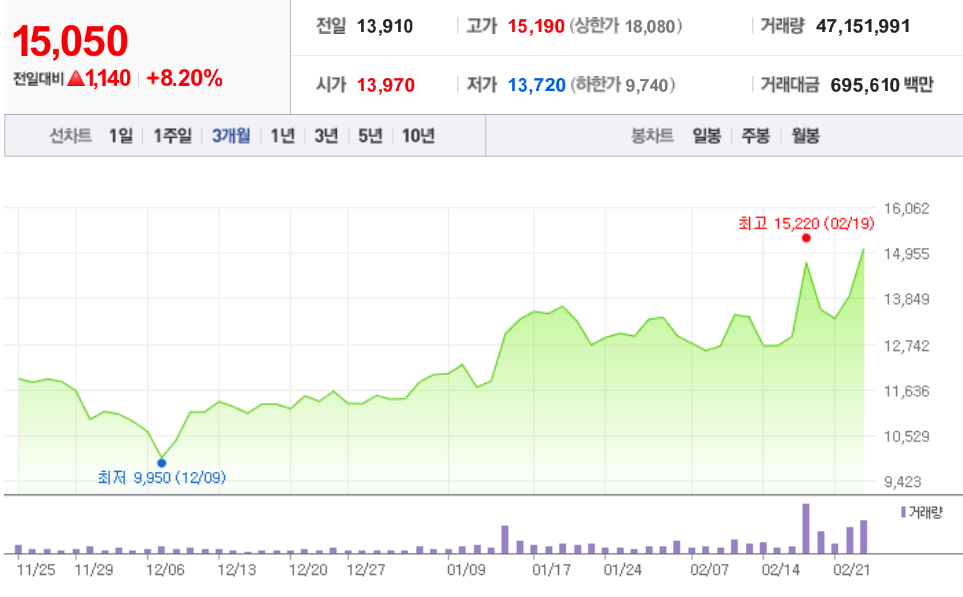 - 최근 흐름: 2월 25일 기준 주가는 전일 대비 1140원(+8.2%) 상승하며 시장의 긍정적인 반응을 이끌어냈습니다.