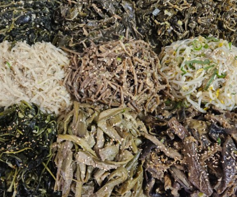 재료: 말린 고사리, 도라지, 호박고지 등 각종 나물, 참기름, 국간장, 다진 마늘