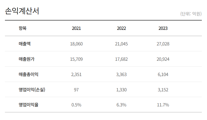 - 매출액: 3조 3,223억 원(전년 대비 22.9% 증가)