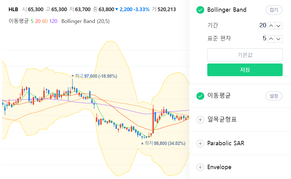 볼린저 밴드를 차트에 설정하는 방법입니다.