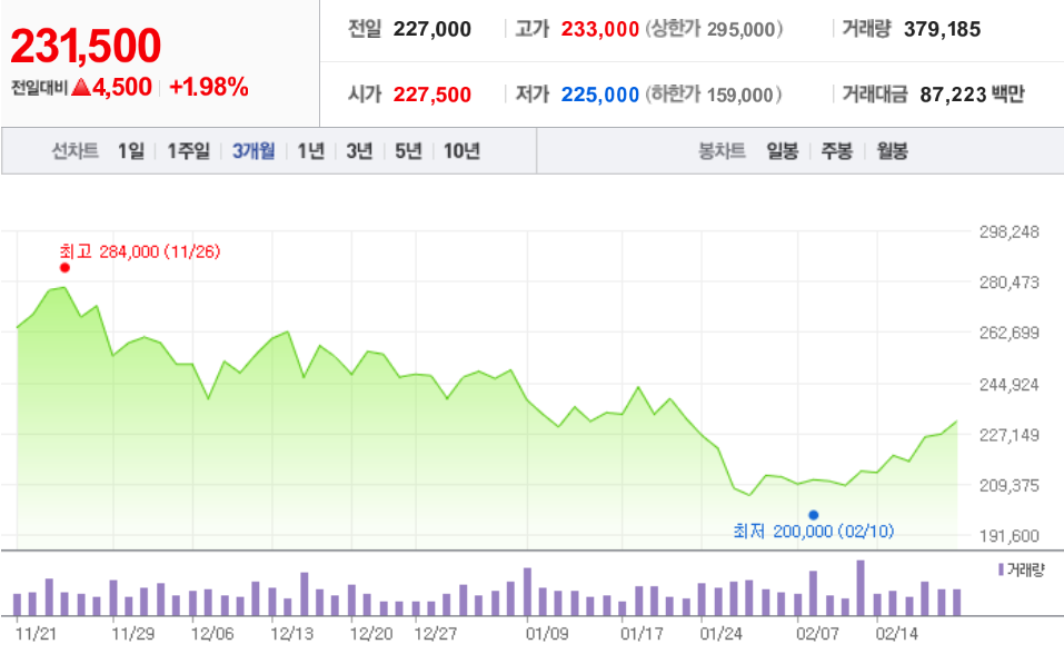 2025년 2월 21일 기준 삼성SDI의 주가는 231,500원으로 전일 대비 4,500원(1.98%) 상승하며 단기 반등세를 보였습니다. 최근 3일 동안 주가는 219,500원에서 시작해 6,000원 상승했으며, 이는 긍정적인 기업 뉴스와 코스피 지수 반등에 힘입은 결과로 보입니다. 그러나 주가의 변동성을 살펴보면, 2월 초부터 중순까지 205,500원에서 231,500원 사이를 오가며 등락을 거듭하고 현재 주가는 52주 최고가인 494,500원 대비 크게 하락한 상태로, 여전히 장기 하락세에서 벗어나지 못하고 있습니다.